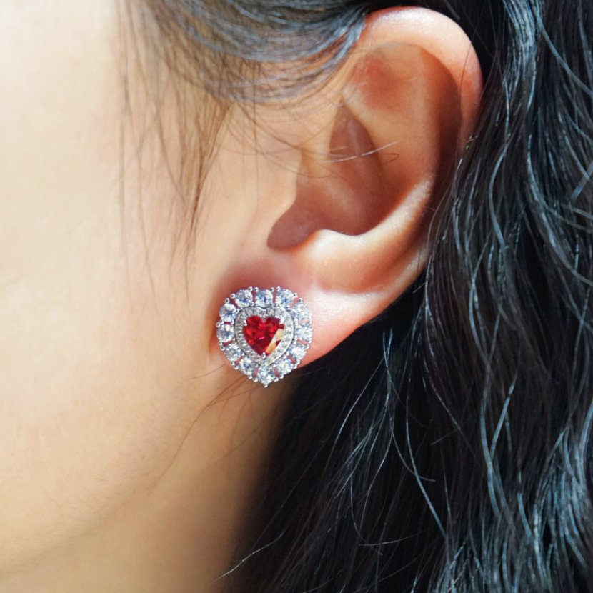 Captivate with these enchanting studs featuring a luminous heart-shaped lab-created ruby/emerald center stone, its passionate crimson hue symbolizing eternal devotion. The gem is embraced by two concentric halos: an inner circle of delicate zirconias shimmering like morning stars, and an outer ring of brilliant stones cascading like a starlit galaxy, creating a gradient celestial glow. Crafted in premium 925 sterling silver with rhodium plating, the cool metallic luster intensifies the ruby/emerald’s fiery allure.
