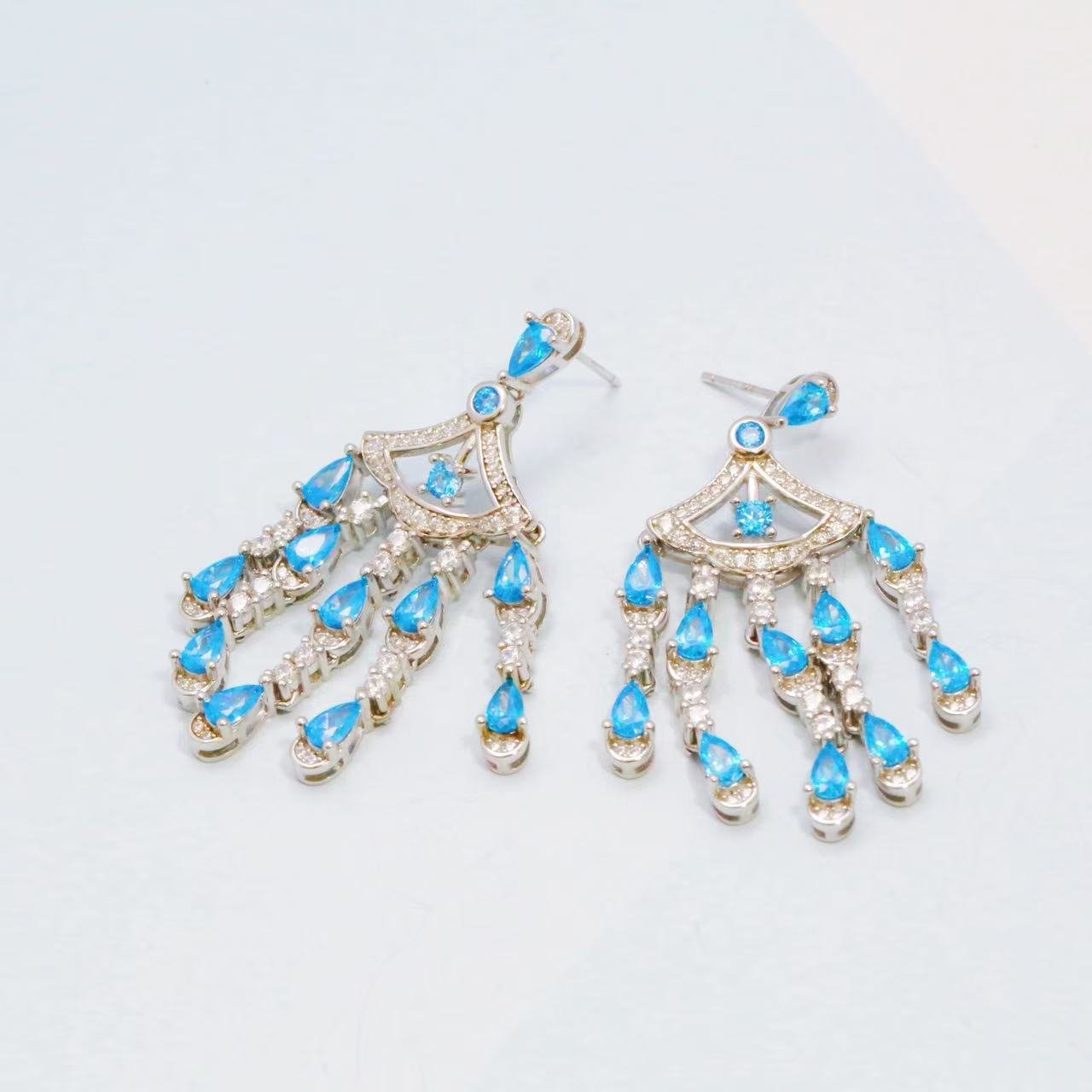 A sculptural rhodium-plated 925 silver umbrella crowns these avant-garde drops, suspending five fluid fringes where teardrop cobalt zirconia and round white zirconia dance in perfect rhythm. Each stone is masterfully set with featherlight prongs, capturing light like dewdrops on steel. As tassels sway, cobalt-and-ice luminescence cascades along your décolletage – a starry waterfall defying gravity. The marriage of sharp geometric lines and liquid gem movement crafts wearable poetry. From gallery openings to moonlit galas, these transformative jewels sculpt light and shadow at your ears.