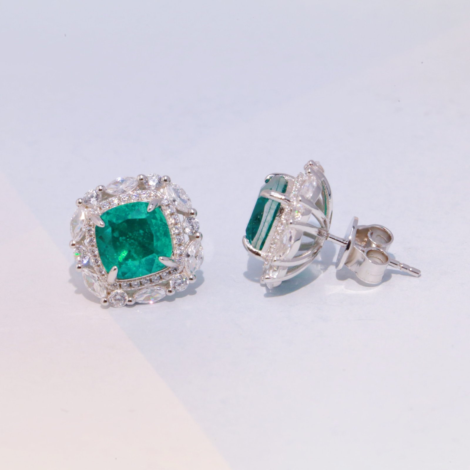 emerald stud earring features a silver setting with gold plating